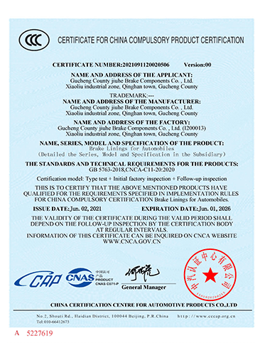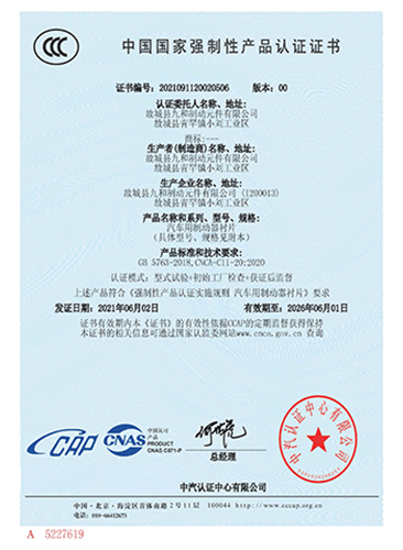 故城縣九和制動(dòng)元件有限公司主導(dǎo)產(chǎn)品為:汽車剎車片、裝載機(jī)剎車片。剎車片采用高溫高壓的熱壓工藝、設(shè)備、生產(chǎn)線、能保證質(zhì)量穩(wěn)定,有為主機(jī)廠配套生產(chǎn)的經(jīng)驗(yàn)和能力。劉如根商標(biāo)是公司主要商標(biāo),公司還有飛人標(biāo)牌、蛟龍牌、橫空出世等品牌!公司有多個(gè)剎車片檢驗(yàn)設(shè)備,剎車片摩擦性能定速摩擦試驗(yàn)機(jī)與國(guó)家非金屬礦制品檢驗(yàn)中心試驗(yàn)機(jī)是同公司生產(chǎn)的同型號(hào)試驗(yàn)機(jī)。拖曳試驗(yàn)機(jī)2020年通過(guò)中國(guó)建材檢驗(yàn)集團(tuán)咸陽(yáng)有限公司檢驗(yàn)合格,剪切試驗(yàn)機(jī);布氏和洛氏試驗(yàn)機(jī)。2021年公司通過(guò)國(guó)家強(qiáng)制性CCC認(rèn)證、通過(guò)過(guò)19001-2000idt ISO 9001:2015質(zhì)量體系認(rèn)證,IATF16949認(rèn)證,歐盟Emark認(rèn)證。剎車片執(zhí)行GB/T11834-2011、GB 5763-2018標(biāo)準(zhǔn)。公司產(chǎn)品先后曾給山東臨工、徐工、卡特彼勒(山工)、徐州美馳車橋公司、肥城金城橋公司,山東路通橋箱科技公司,山東博士樂公司,郯城郯液公司,日照金···